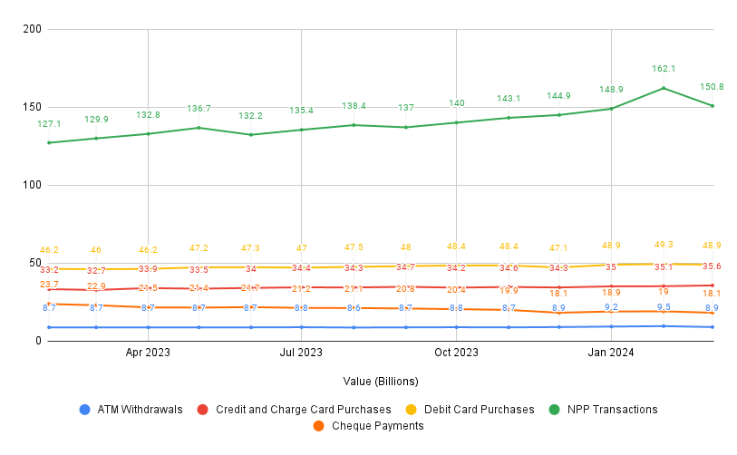 There was movement in payment volumes and a general activity reduction across all payment types except for NPP.